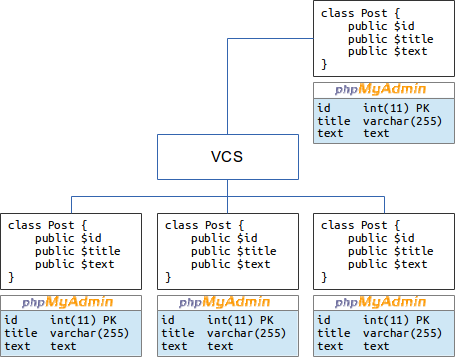Три программиста пишут код проекта. И с кодом у них нет проблем. Есть три рабочих машины, центральный репозиторий и главный рабочий сервер, берущий файлы из этого же репозитория. Работа кипит. у каждого на своём компьютере установлен PhpMyAdmin, что им позволяет время от времени вносить изменения в свою базу данных.