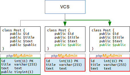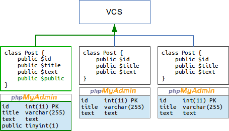 И вот новый программист для выполнения своей задачи добавил в таблицу базы постов блога новое поле public и изменил выборку постов на сайте так, чтобы отображались только открытые записи. Изменение кода модели Post он сохранил в новую ревизию и отправил в центральный репозиторий: